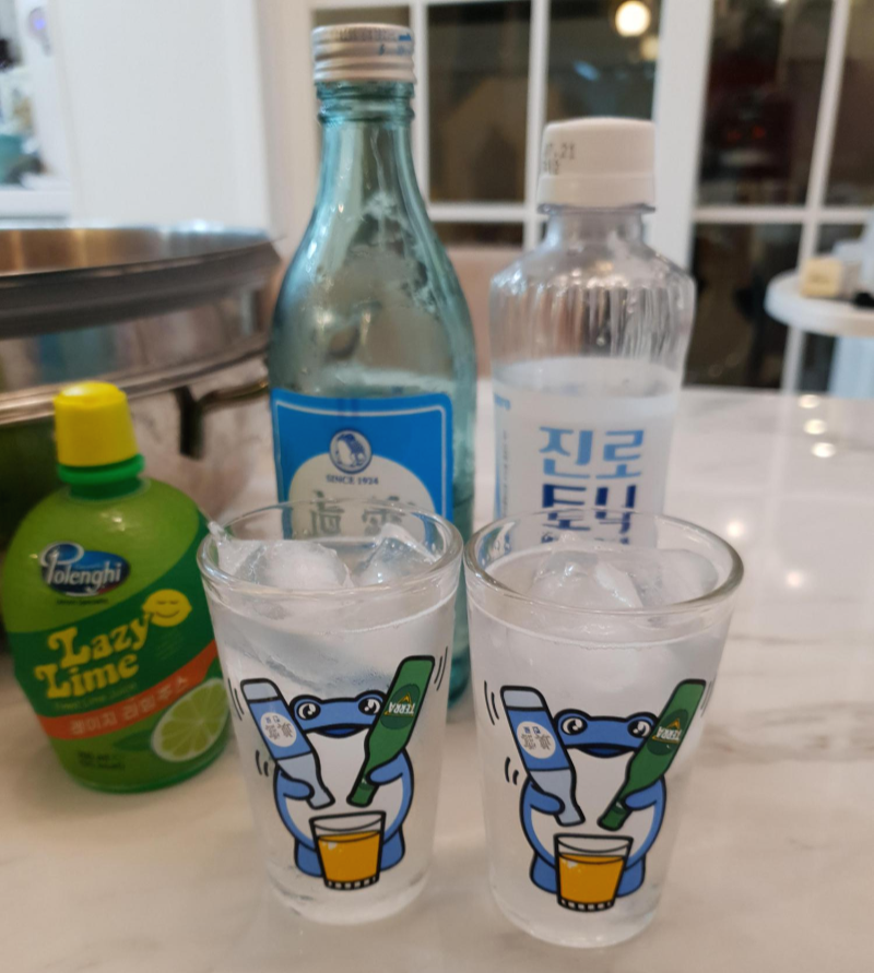 "얼음 4조각 + 소주 + 토닉워터 + 라임 1방울"