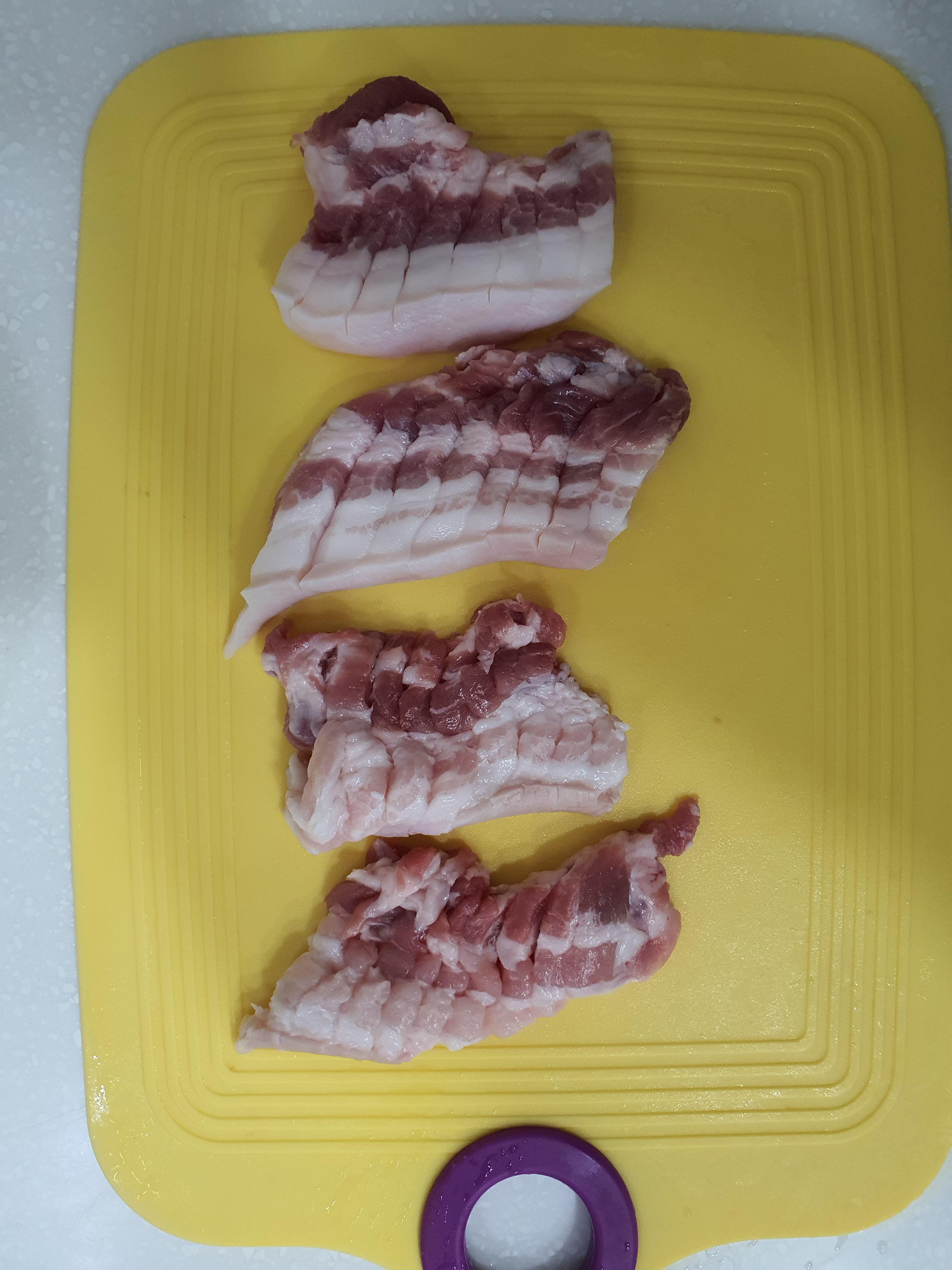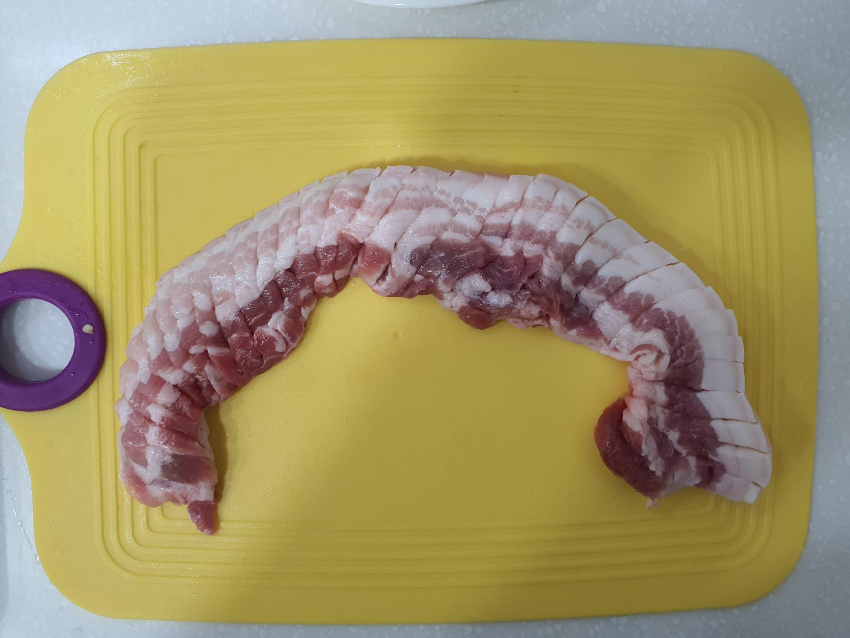 이제 삼겹살을 굽기 좋은 크기로 잘라야 한다.
