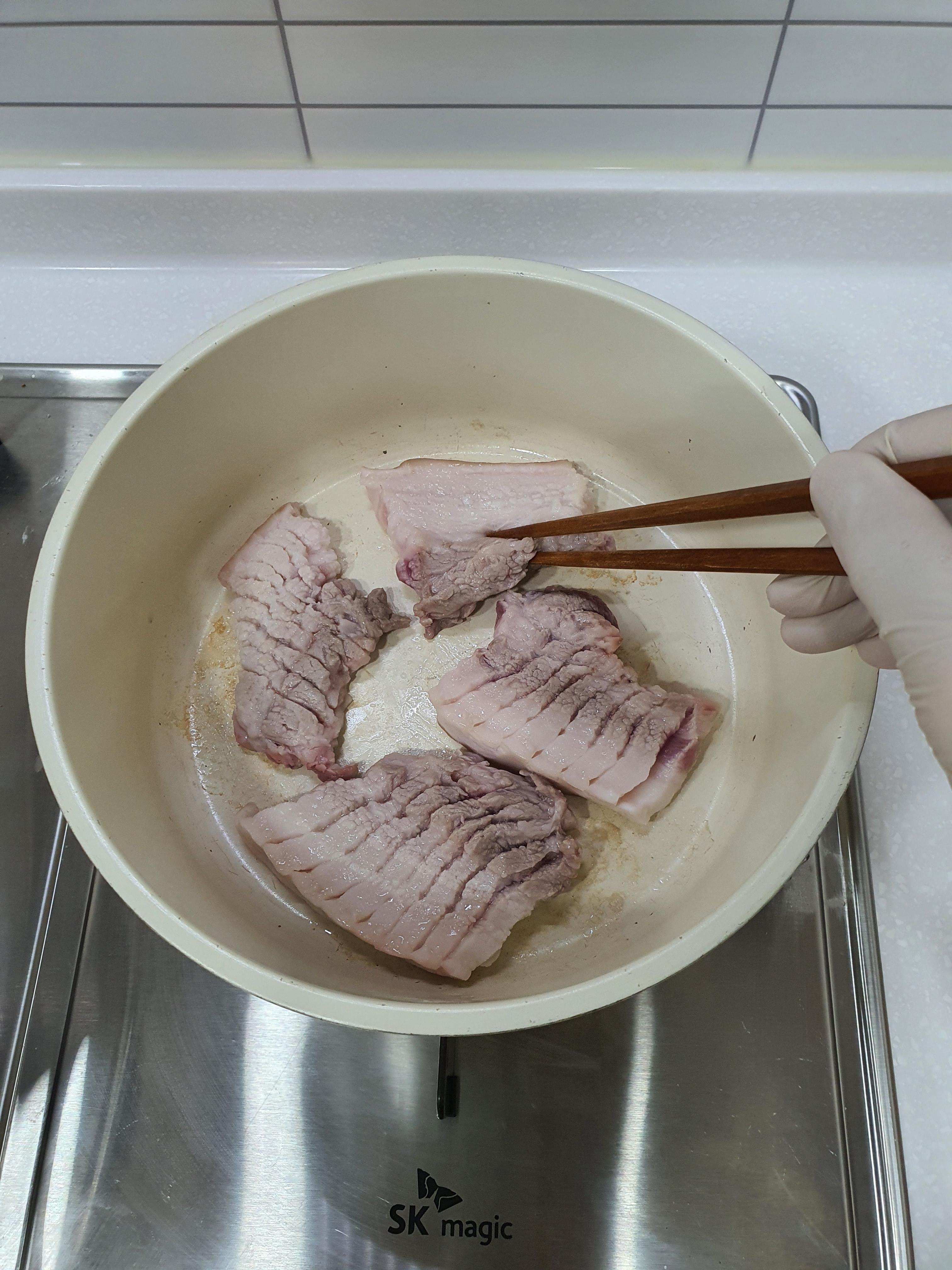 이 면수의 짭짤함과 삼겹살의 간을 맞춰줘야 한다.