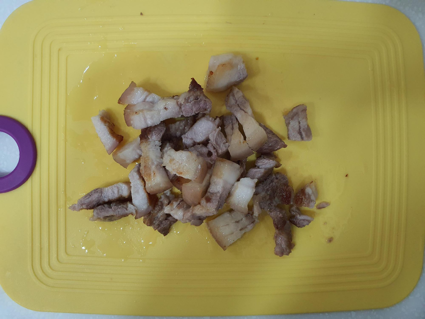 도마위에 살짝 식힌 삼겹살을 잘게