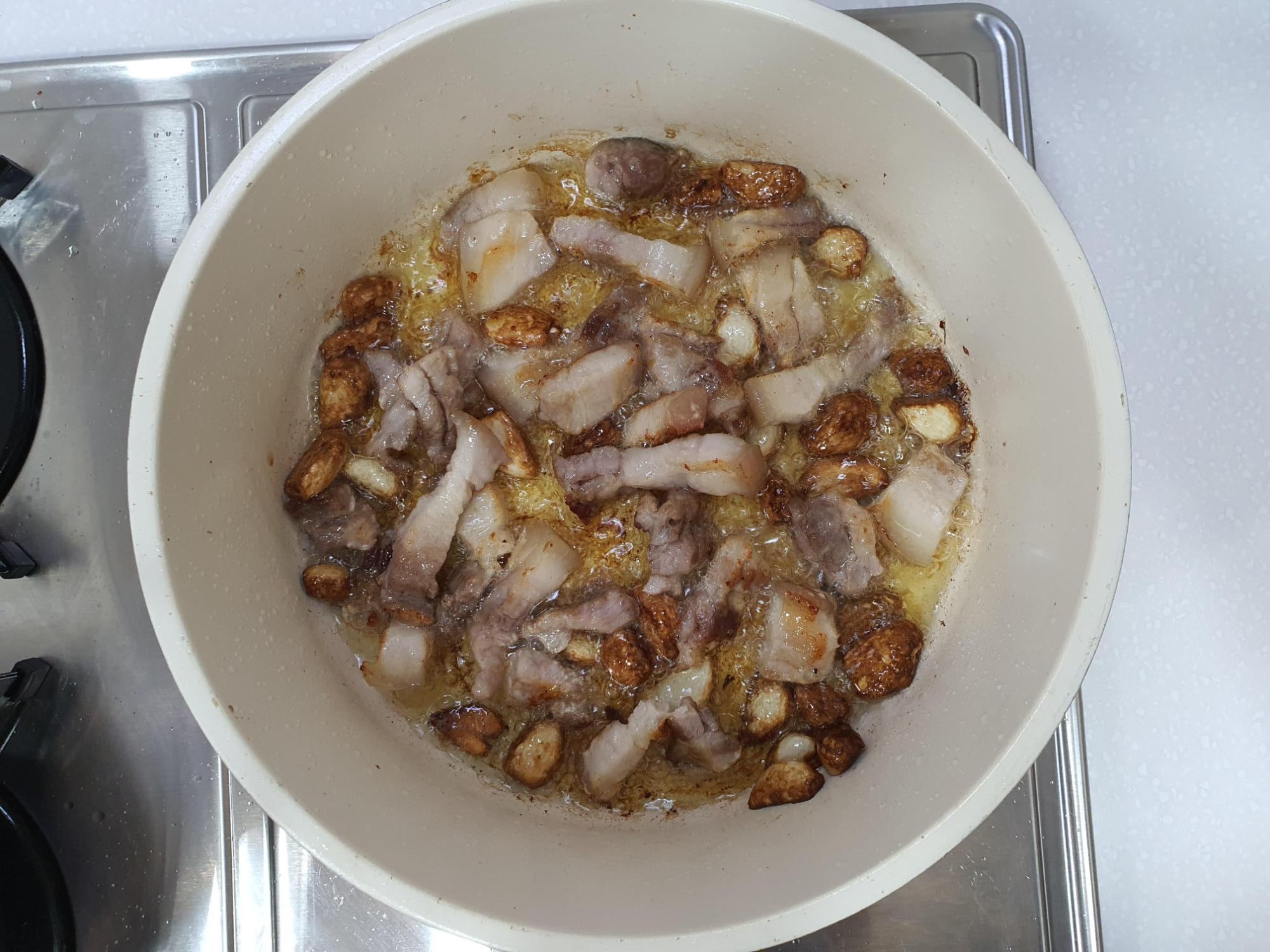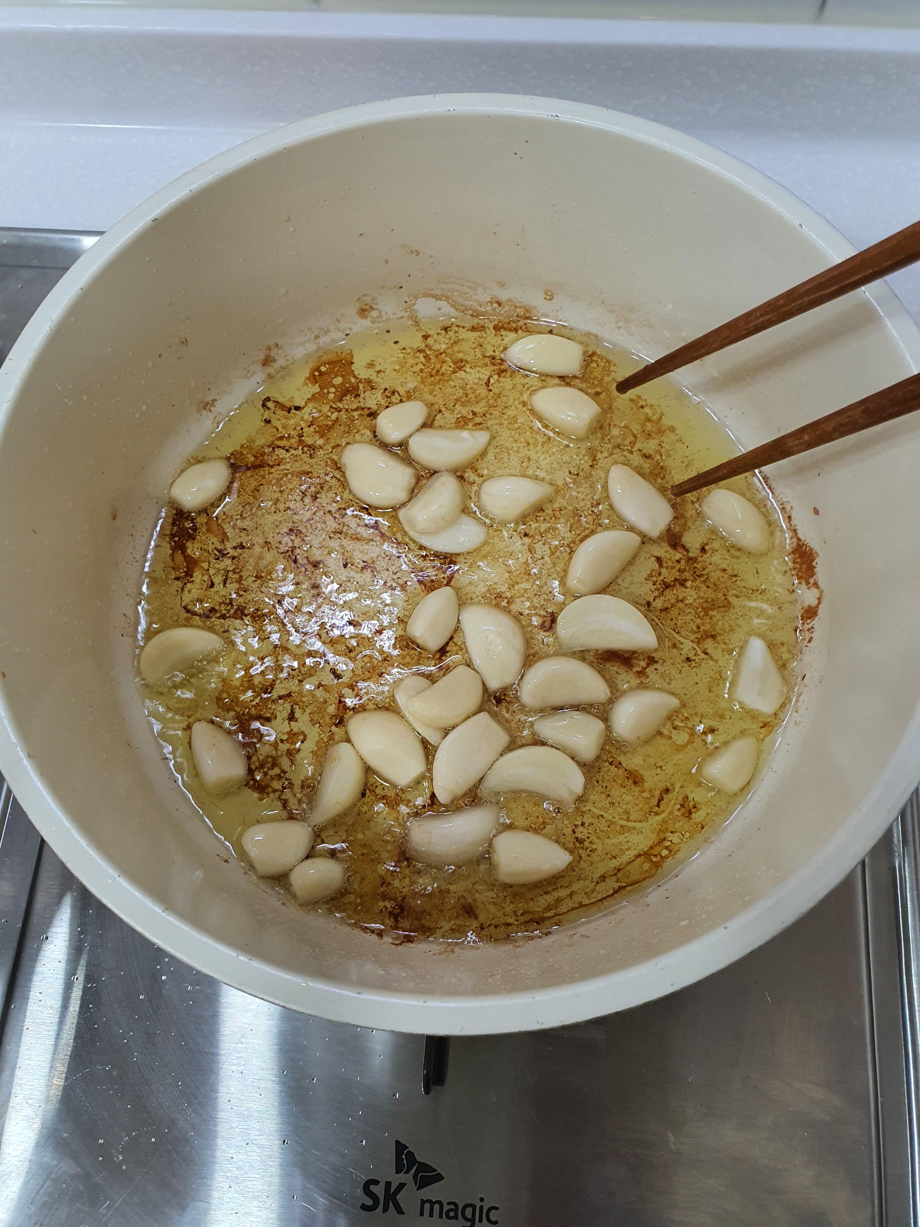 삼겹살 기름과 올리브유로 마늘을 볶고,