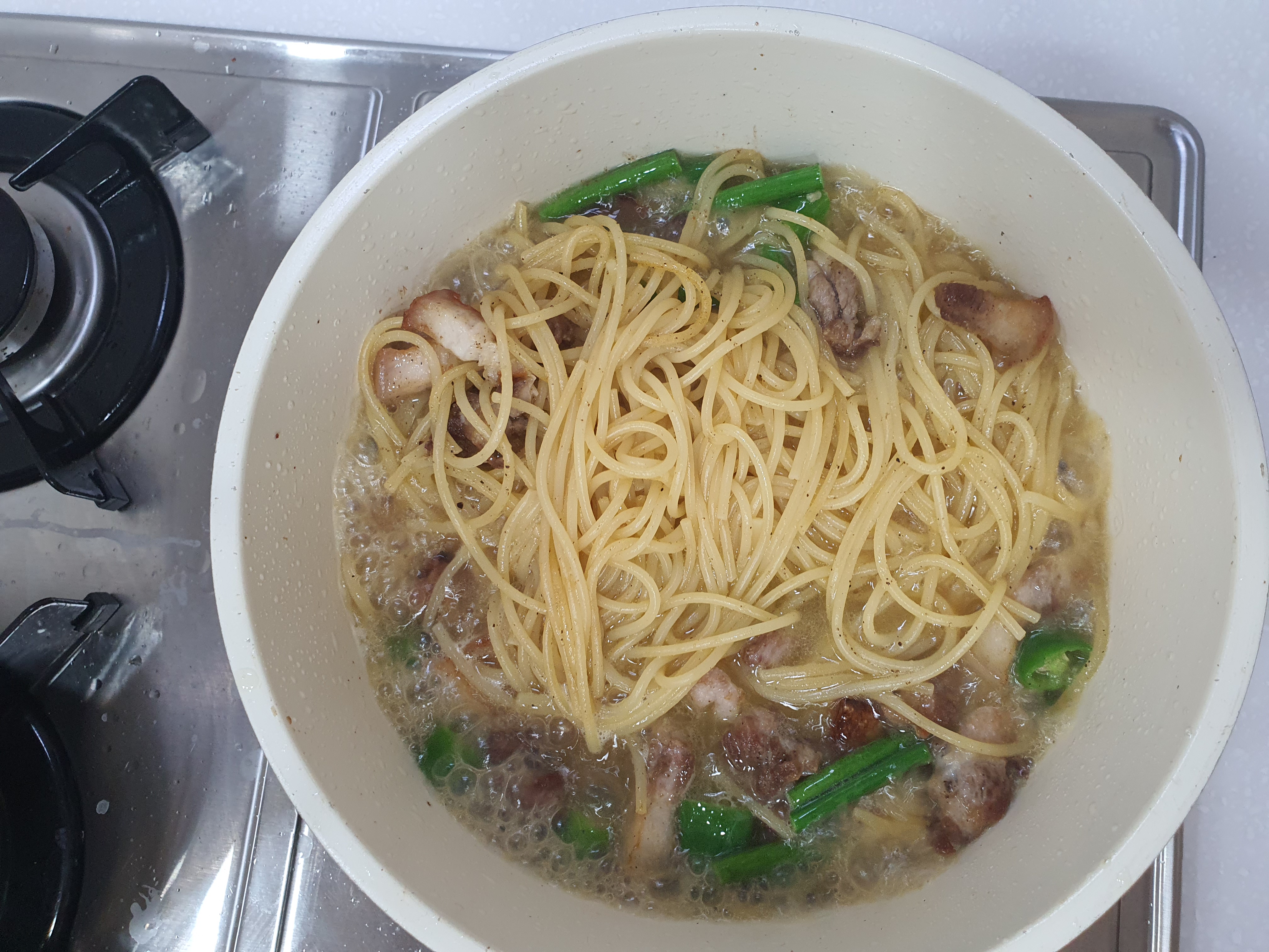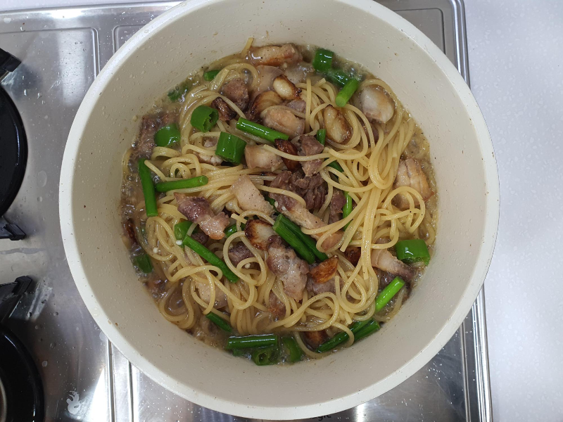 파스타 면을 삼겹살 마늘 기름+면수에다가