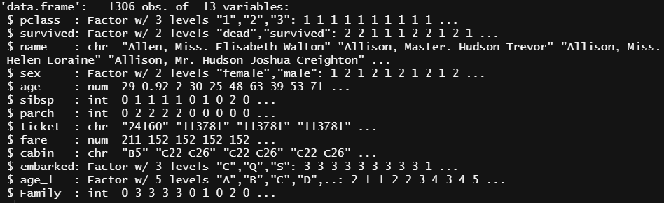 $ pclass : Factor w/ 3 levels "1","2","3": 1 1 1 1 1 1 1 1 1 1 ...