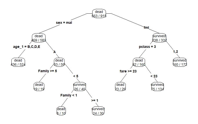 아래의 그림을 보면, 총 915명의 승객 중 563명을 사망자(dead)로 분류했으며, 성별이 여자(fml)인 332명 중 238명이 생존자(survived)로 분류되었음을 의미한다. prp 함수는 rpart.plot 패키지에 속한 함수이며, type, extra 등의 인자를 사용하여 그래프 모양을 바꿀 수 있다.