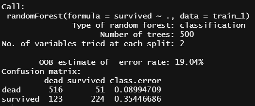 랜덤 포레스트 분석결과에서 "OOB estimate of error rate"의 값은 에러 추정치로서 값이 낮을수록 분류모델 성능이 좋다고 할 수 있는데, 생성된 모델을 보면 OOB가 약 19%로 분류모델의 성능이 썩 좋게 나타나진 않고 있으며, Confusion Matrix의 class.error값이 survived일 때 약 0.35로 높게 나타나 있음을 알 수 있다.