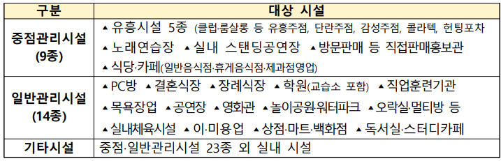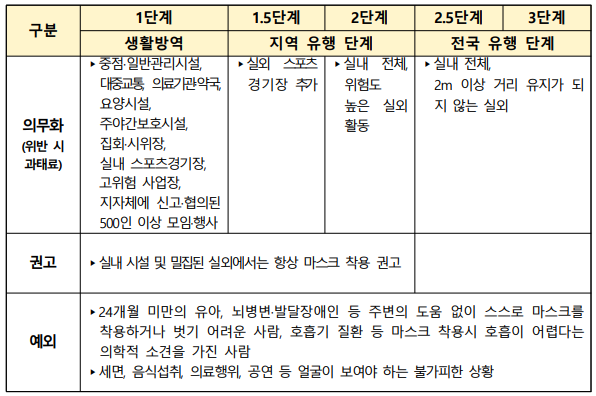 생활 방역 체계에서도 중점·일반관리시설 23종에 대해 마스크 착용, 출입자 명단 작성·관리, 주기적 소독·환기 등의 수칙을 공통적으로 의무화하고,