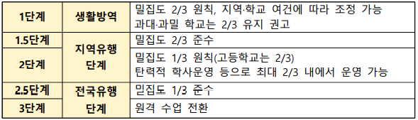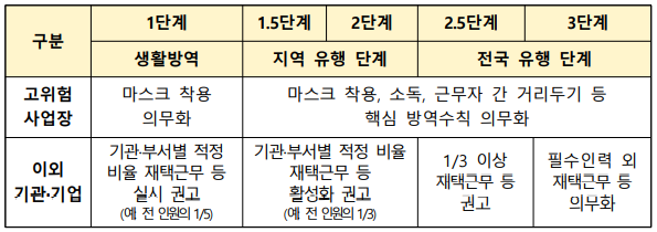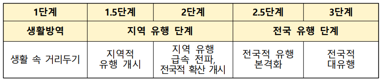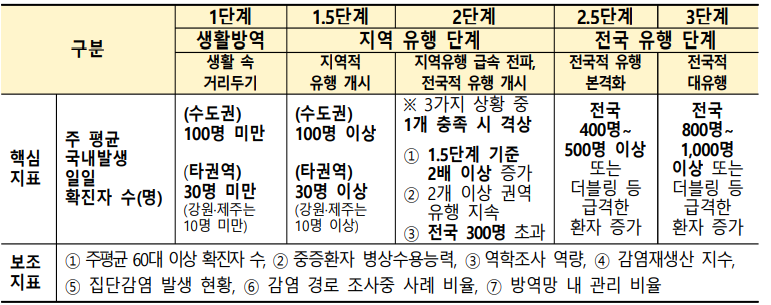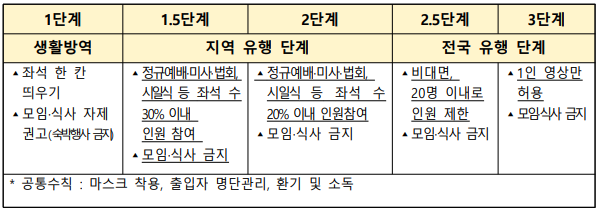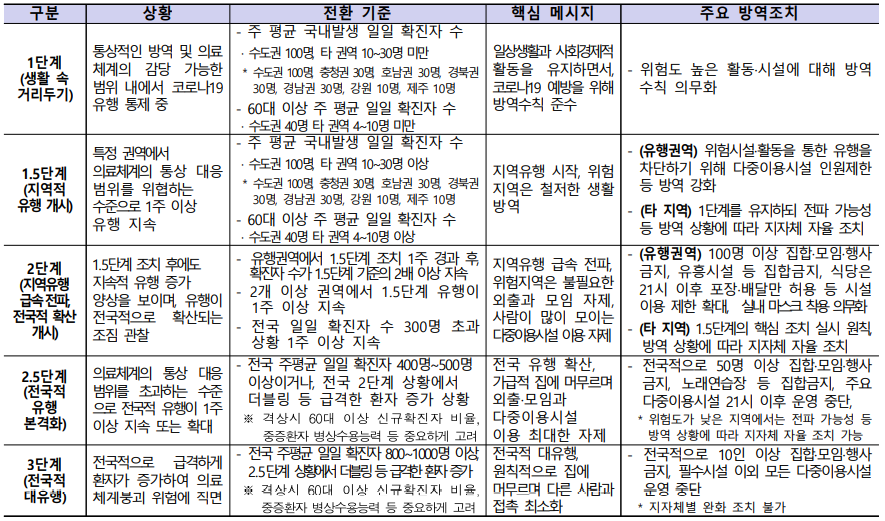생활방역(1단계), 지역 유행(1.5, 2단계),