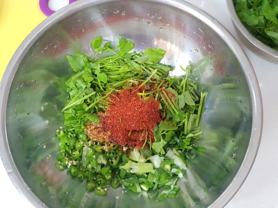 고춧가루 2스푼을 뿌린 후 잘 버무려 준다.