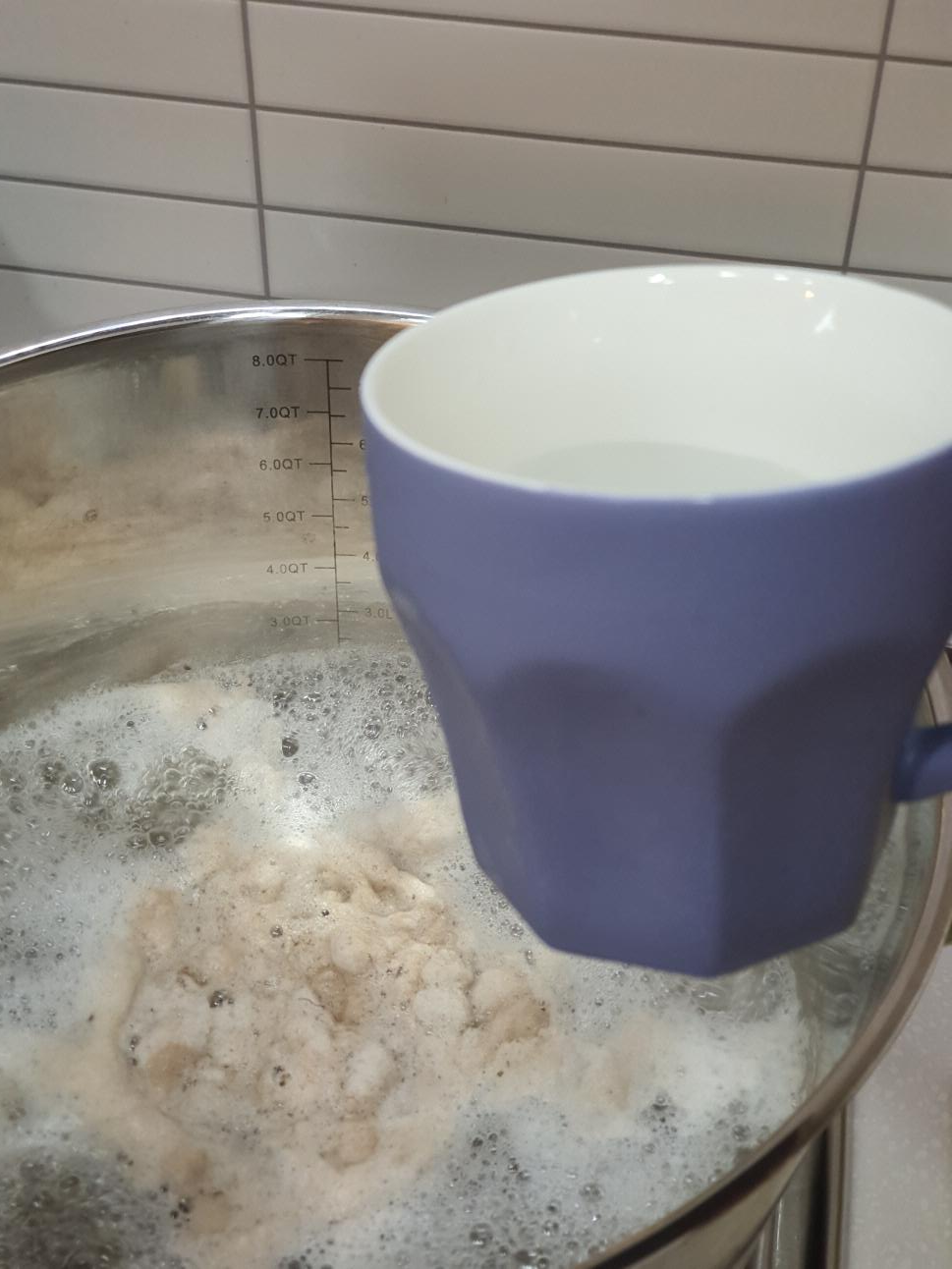2분이 지나면, 찬물을 한 컵 부어준다.