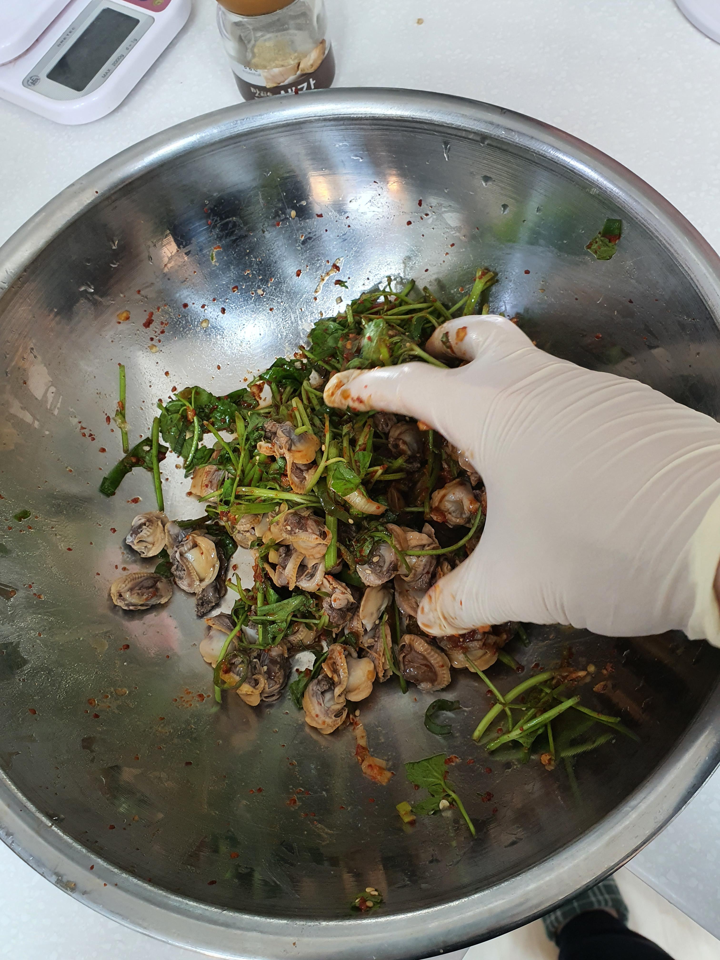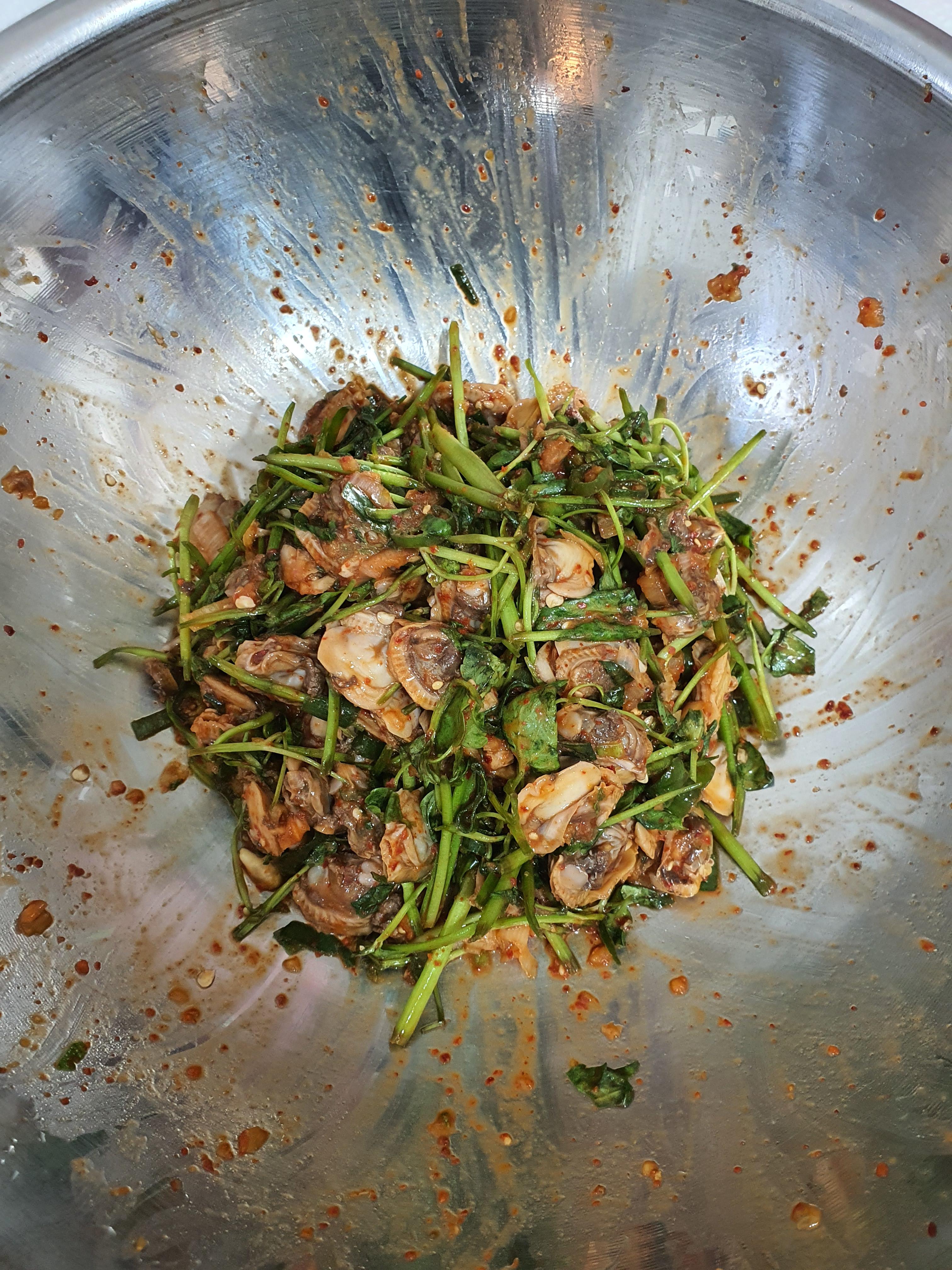 꼬막과 양념된 채소를 골고루 버무려 준다.