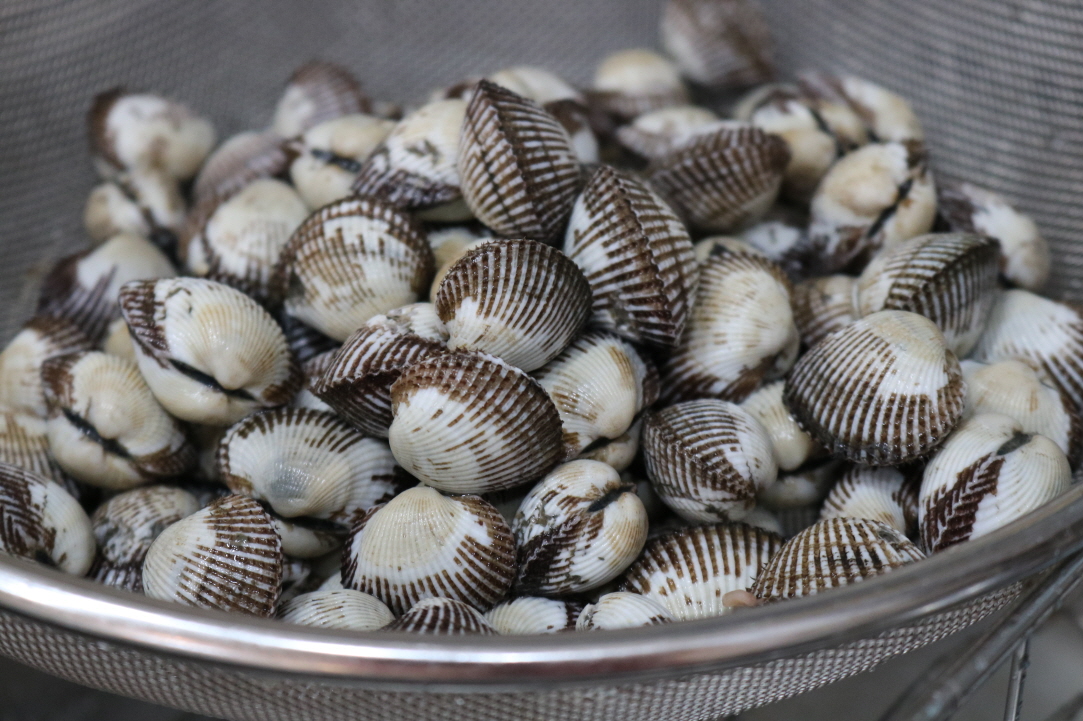 체에 받혀둔 꼬막을 한 개씩 잡고 껍질을 까준다.