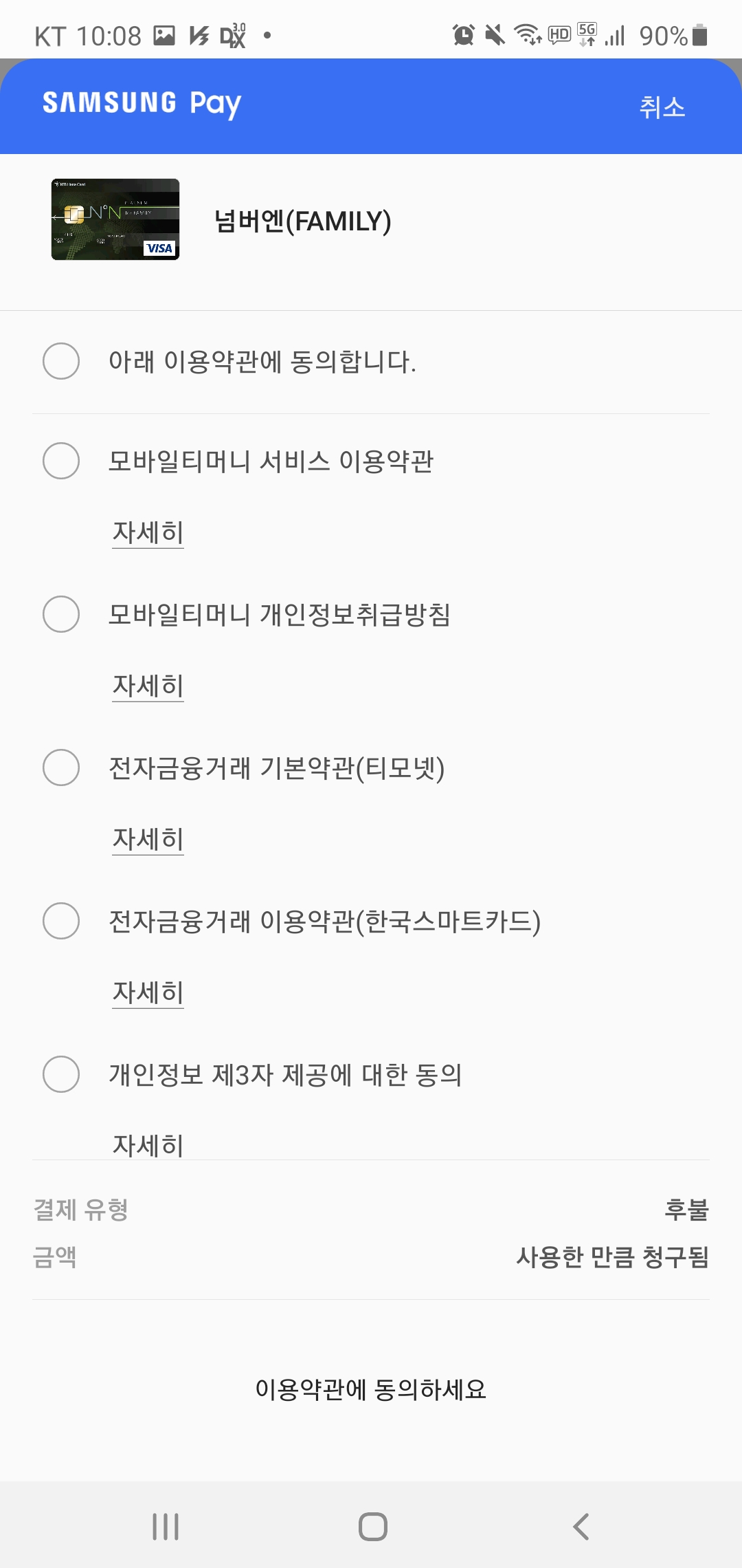 카드 사용을 위한 이용약관에 동의한 후,