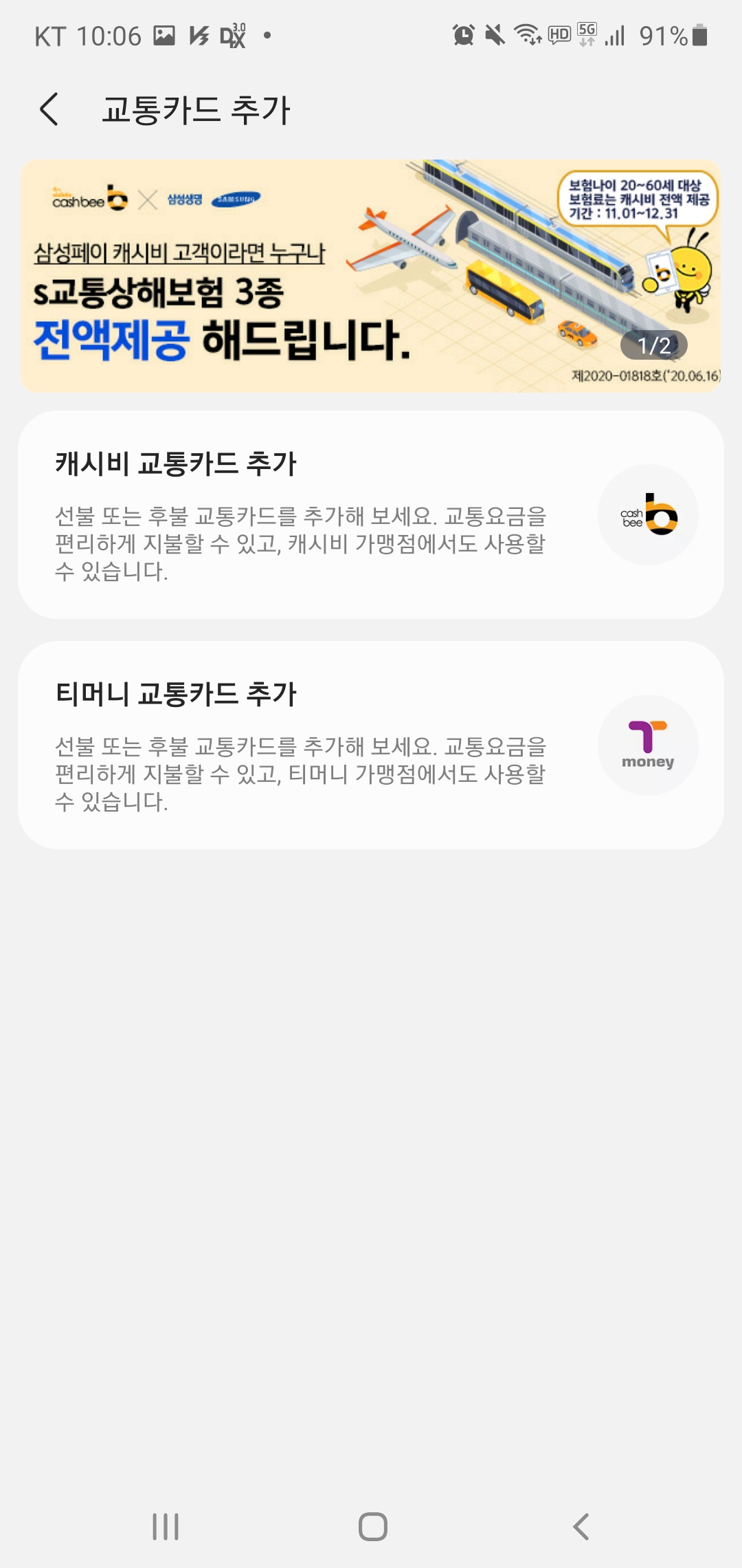 이제 삼성 페이 교통카드 사용을 위한 준비는 다 끝났다.