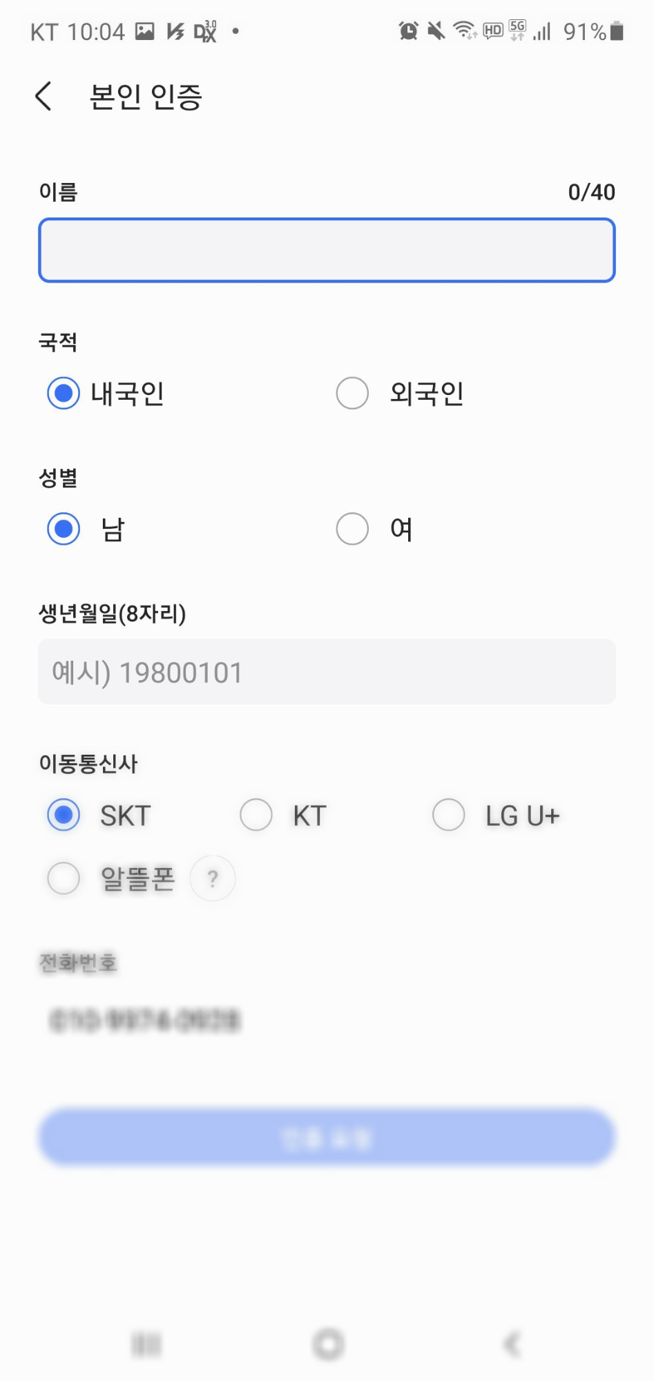 본인 인증을 위한 간단한 개인정보를 입력하고