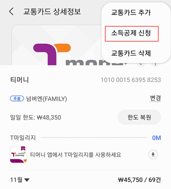 교통카드 상세정보에서 우측 상단을 눌러서